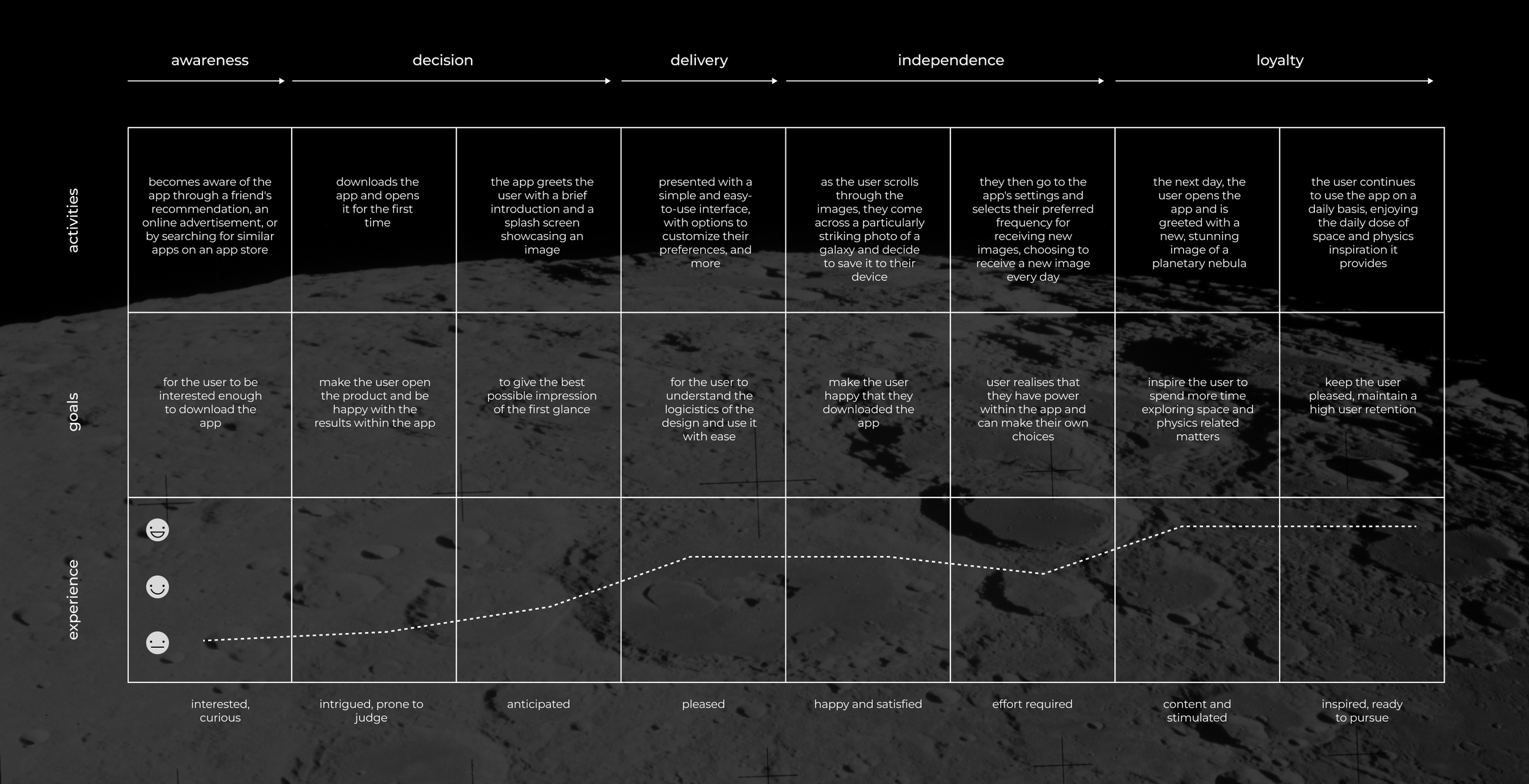 This is a customer journey map of a potential user who would become aware of the app, download it and use it. This type of map helps businesses understand the customer's experience and can identify any potential pain points or areas for improvement, and I value their use both for concept cases like this one and for other businesses as well.